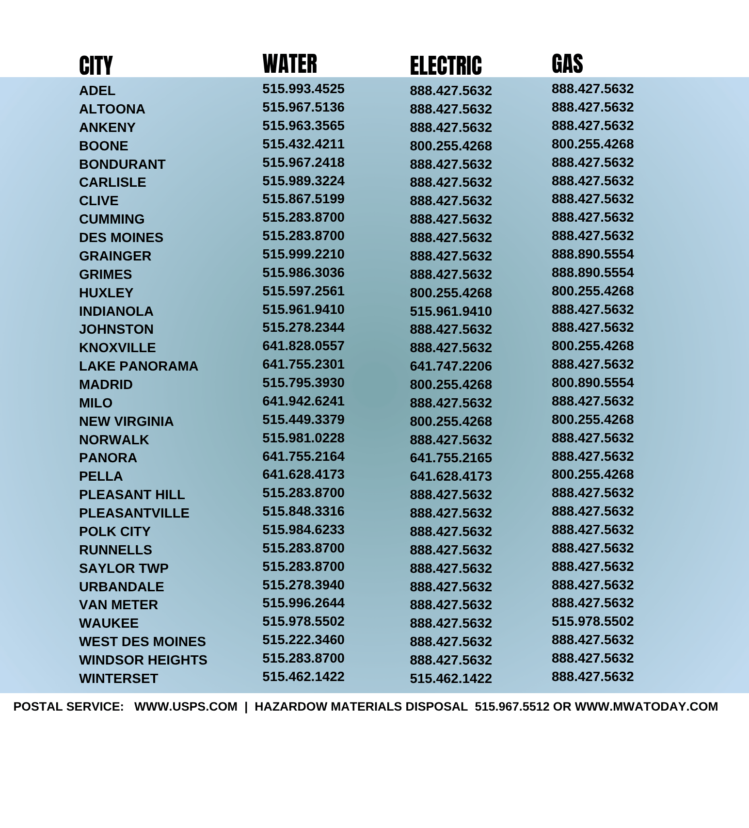 Setting up your utilities is a key step in the moving process. Attached are all key phone numbers by city.